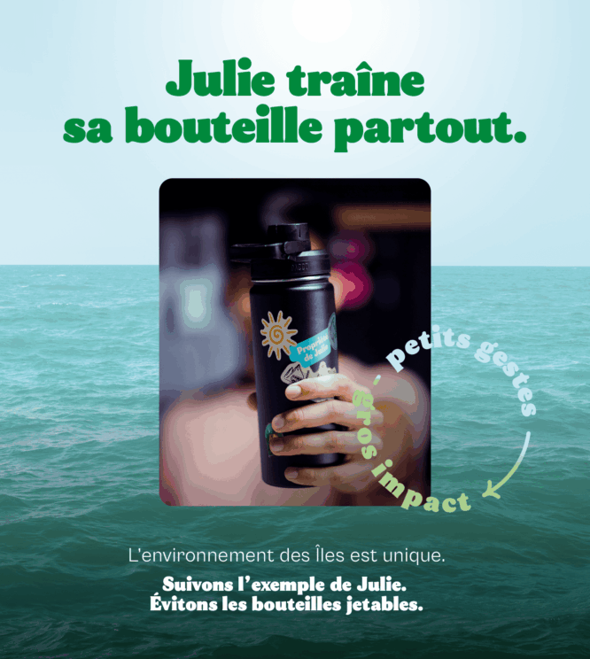 Dans ce mandat, il fallait tenir compte d’une population déjà sensibilisée, mais qui devait être remobilisée avec un discours plus concret et rassembleur. Ainsi, l’axe retenu était simple et fort : « Aux Îles, chaque geste compte. » Ce choix permettait de traduire la réalité insulaire en une idée immédiatement compréhensible, soit celle que dans un écosystème fermé et fragile, où tous les impacts se font ressentir. Le message principal, « Mieux gérer nos matières résiduelles et notre eau, c’est prendre soin de nos îles. », misait sur l’attachement au territoire, la responsabilité partagée et le sens du bien commun. L’idée n’était pas de faire peur ni de faire la morale, mais de créer une adhésion fondée sur la fierté, l’appartenance et le désir de protéger un milieu de vie commun.